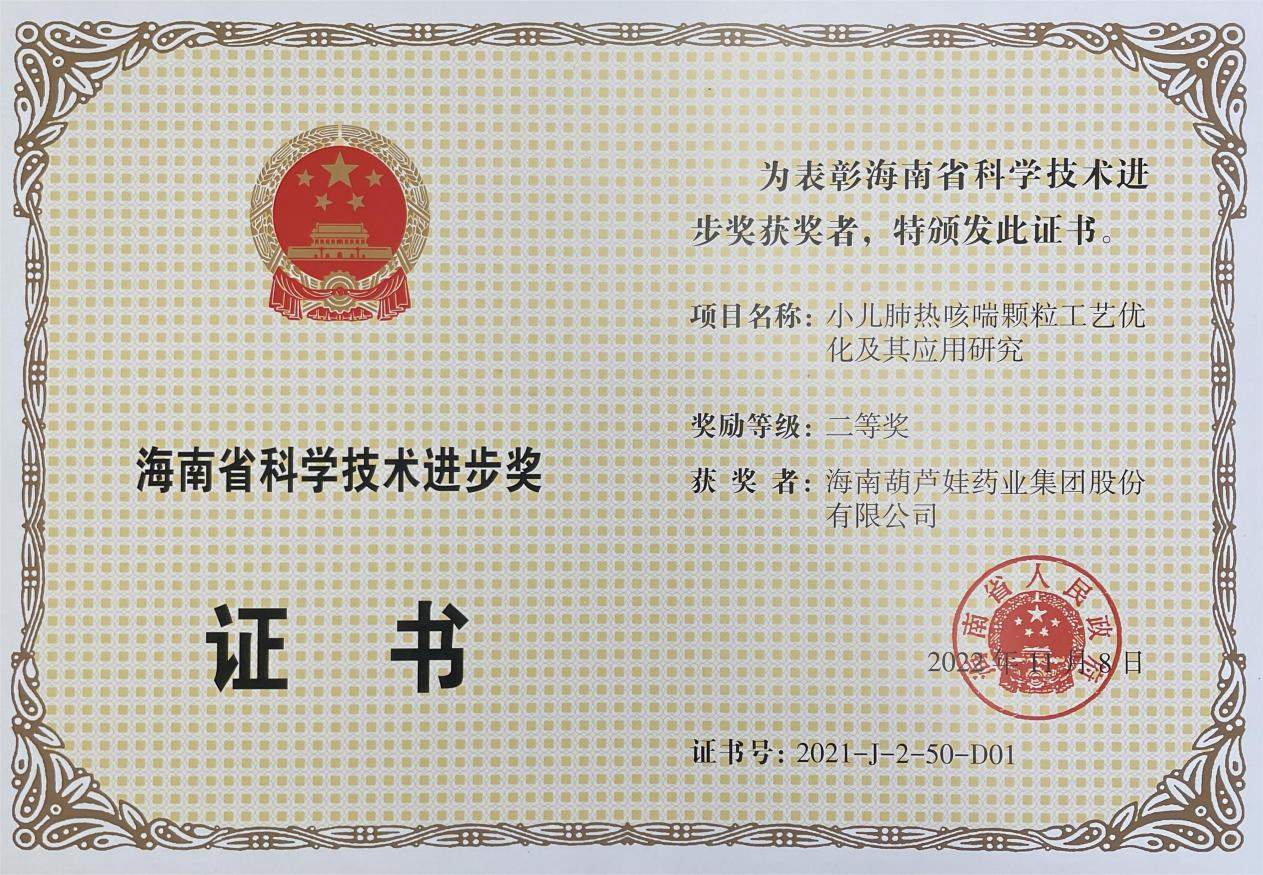 为此,小儿肺热咳喘颗粒的制备方法获得了第二十一届中国专利优秀奖(2019年),专利申请号:ZL201010134951,此次作为专利技术的应用,获得了2021年度海南省科学技术进步奖二等奖。在此之前,z6尊龙牌小儿肺热咳喘颗粒还多次被授予“临床价值中成药品牌”、“中国连锁药店最具合作价值单品”,荣登“中国医药品牌榜”。